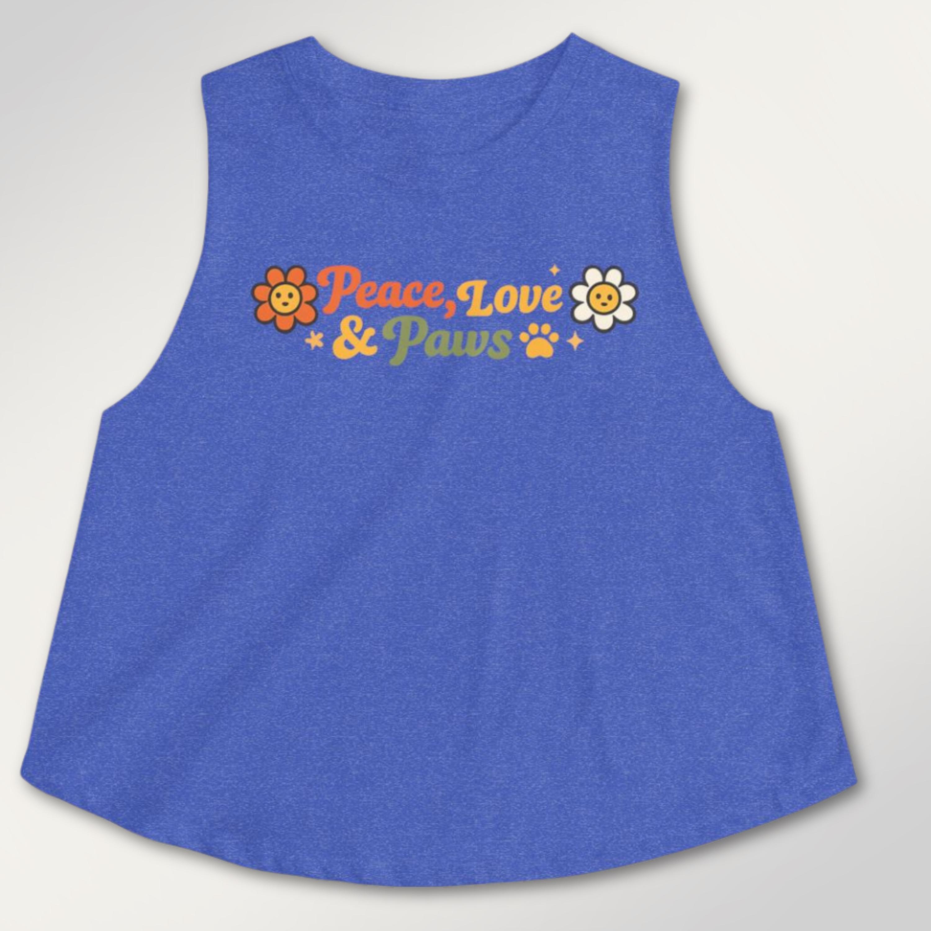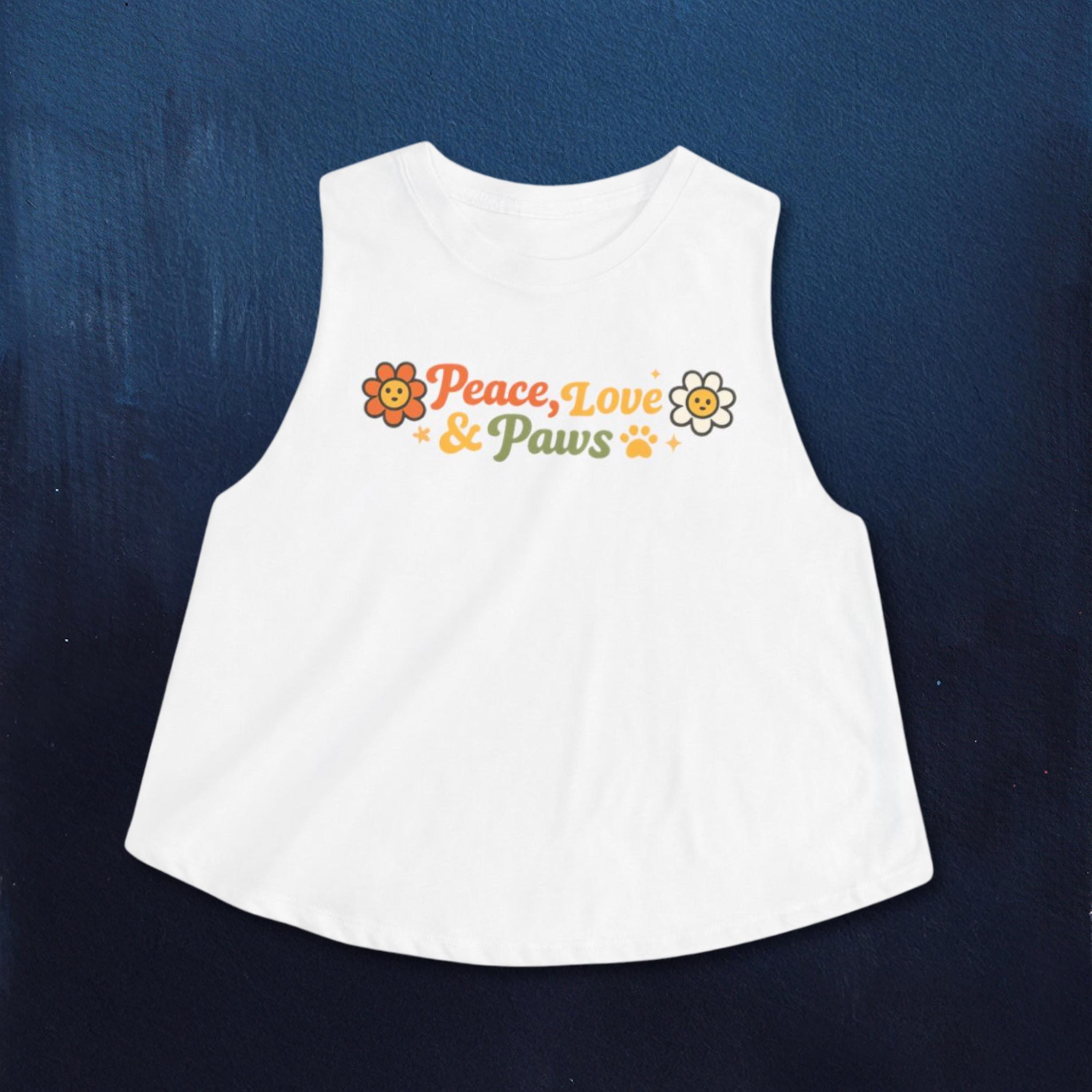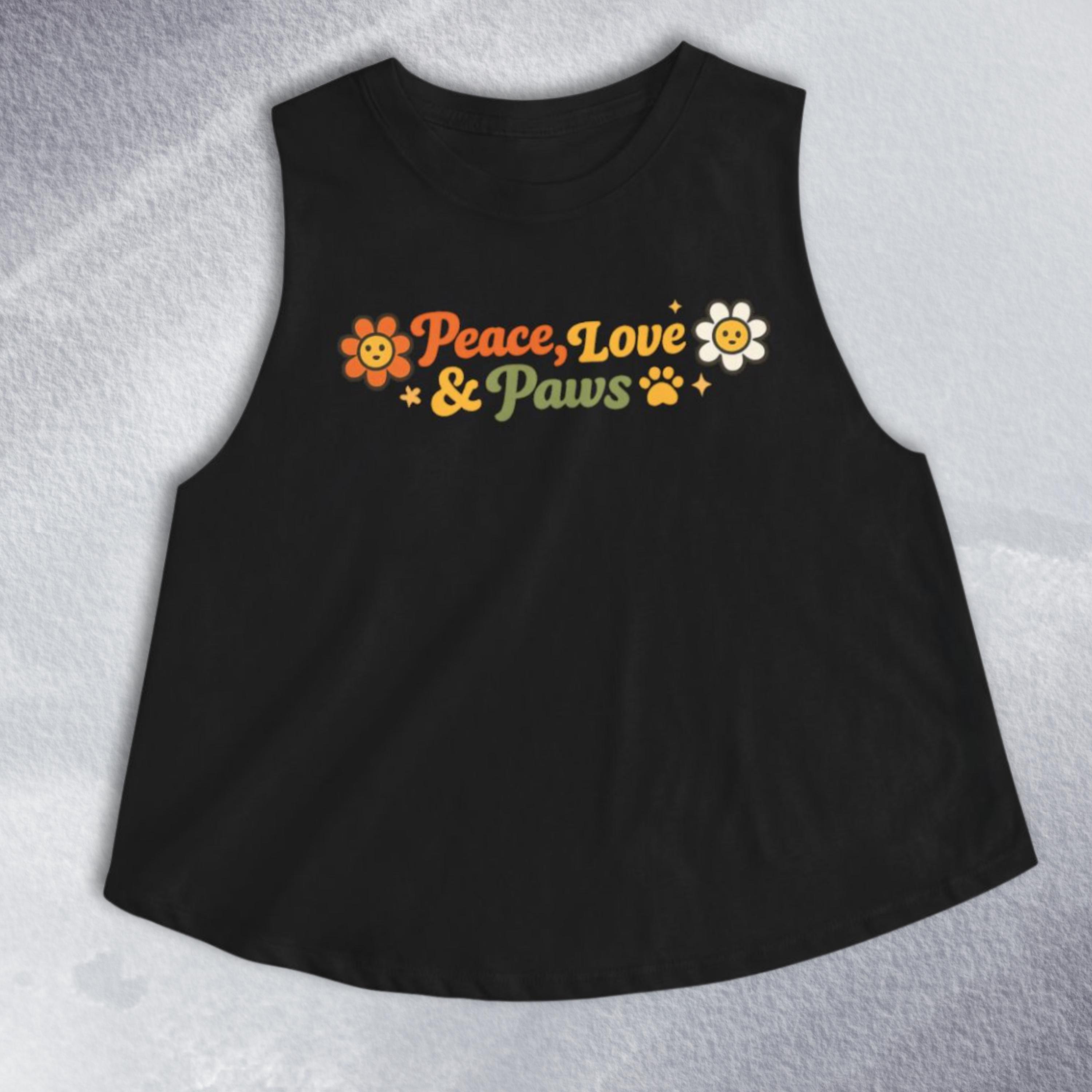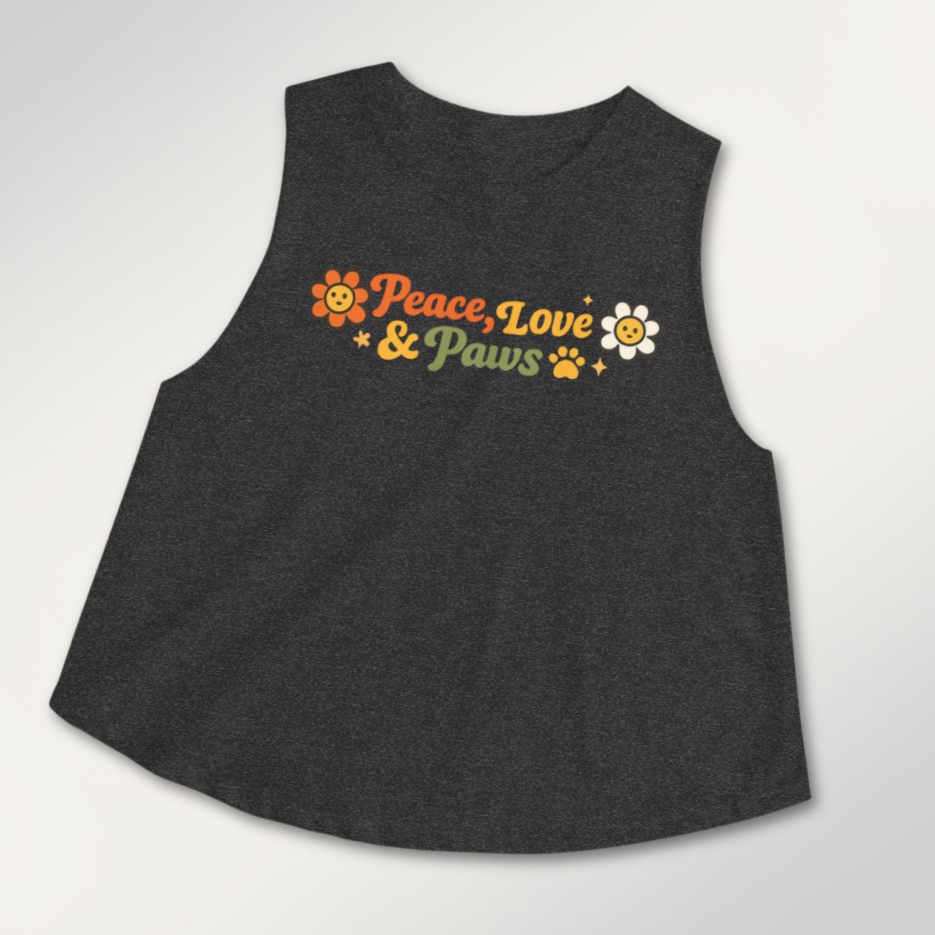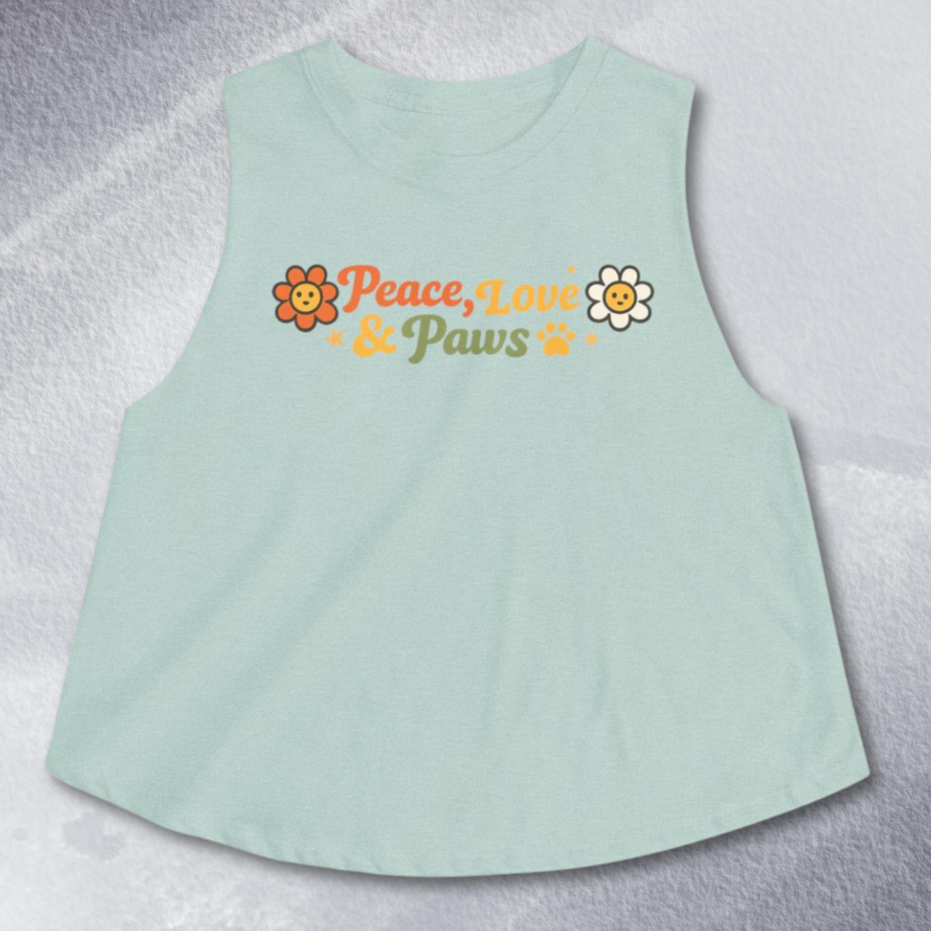 Soft, sunlit, and a little retro—this cropped tank brings a laid-back, pet-loving vibe to warm days and slow weekends. The light, breathable fabric drapes with a relaxed silhouette and raw, cut-off sleeves for an easy, slightly undone look. Front artwork reads “Peace, Love & Paws” in warm, sunset tones with cheerful flower and paw accents—friendly and playful without shouting. Wear it on morning dog walks, weekend markets, or lazy porch afternoons when you want comfort, movement, and a touch of nostalgic charm.