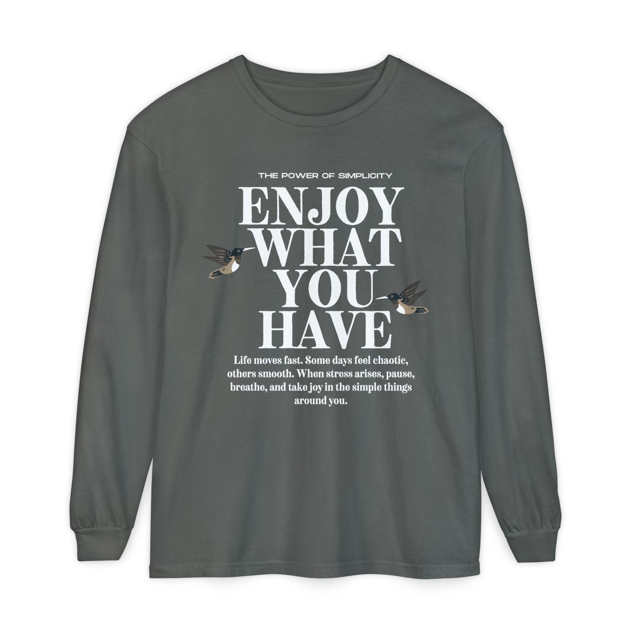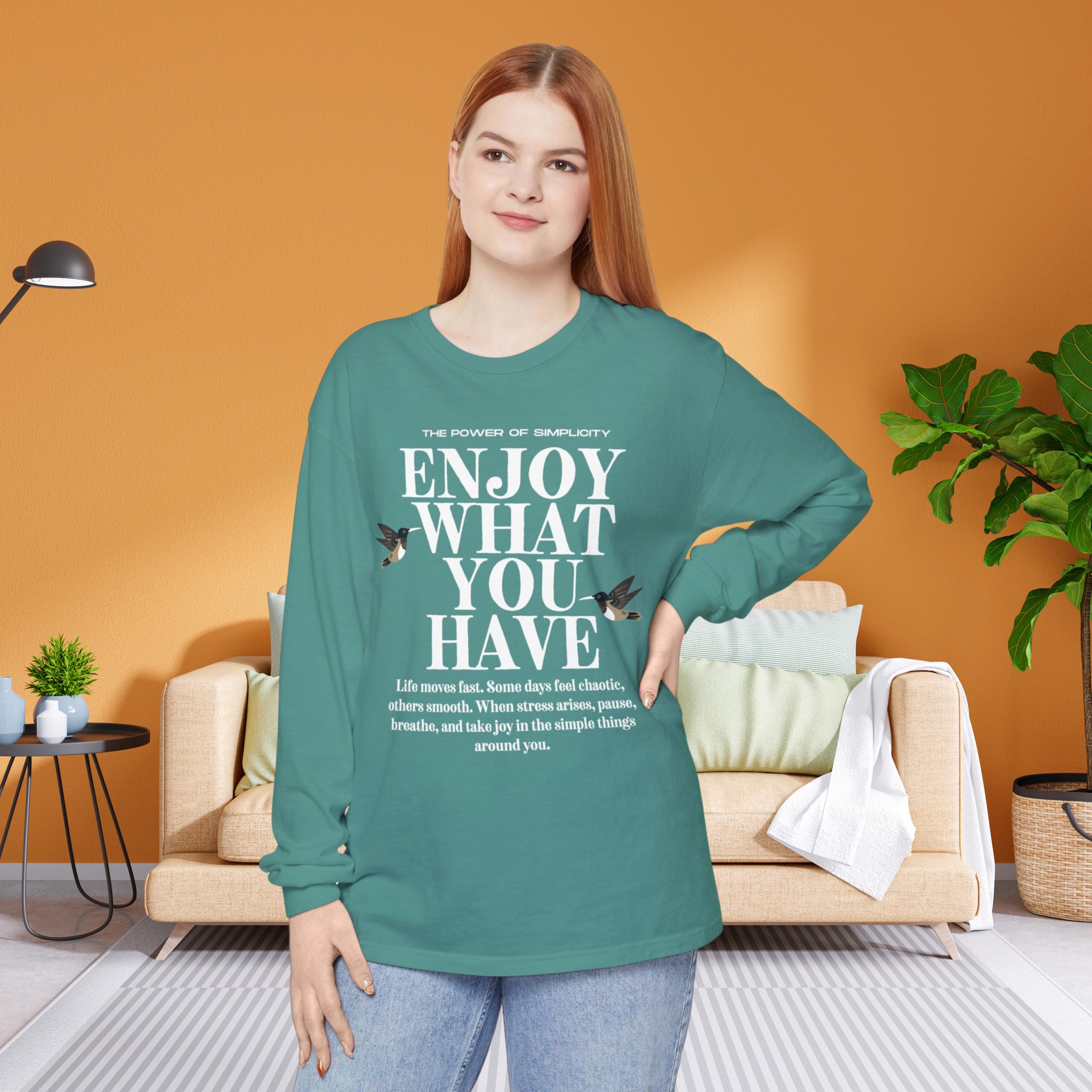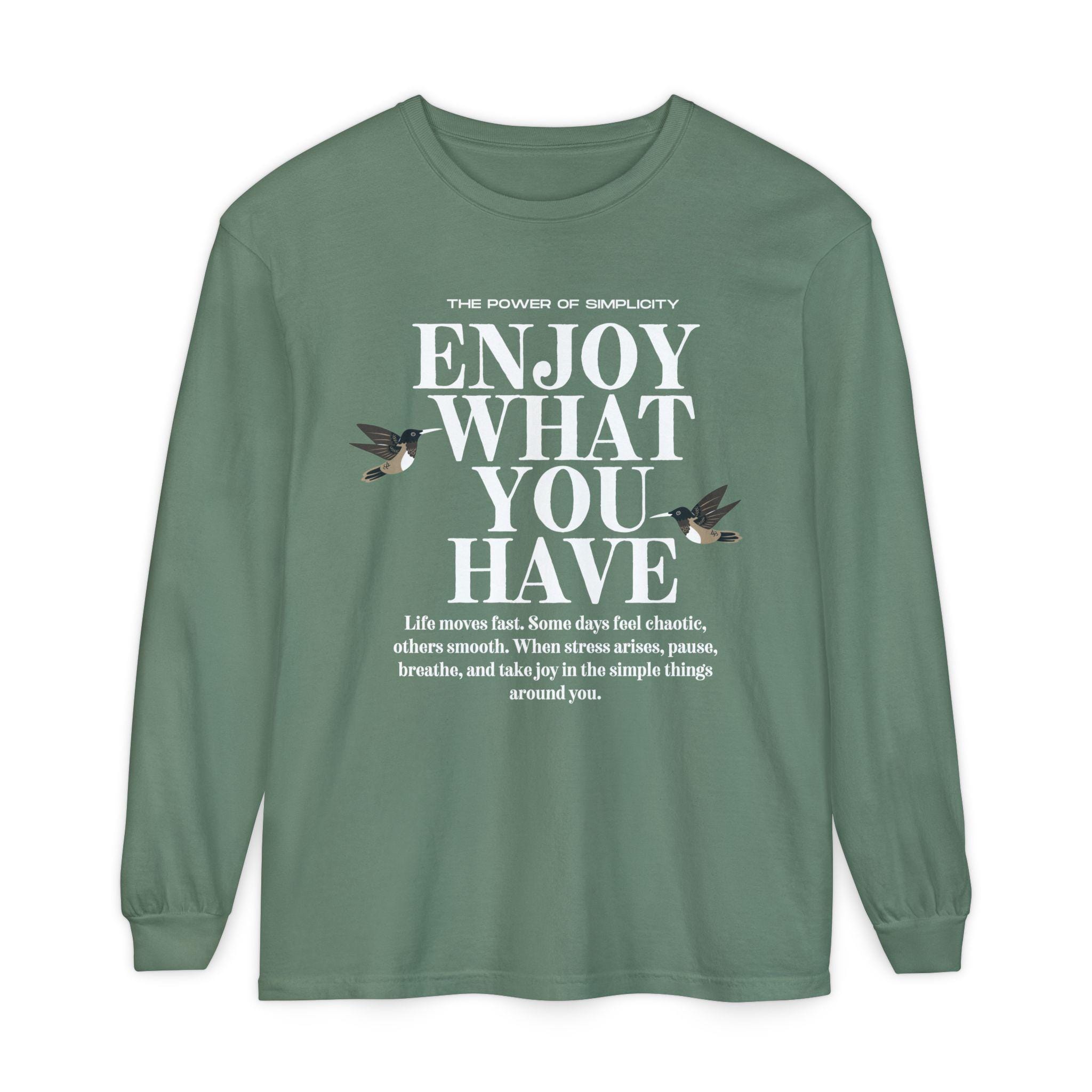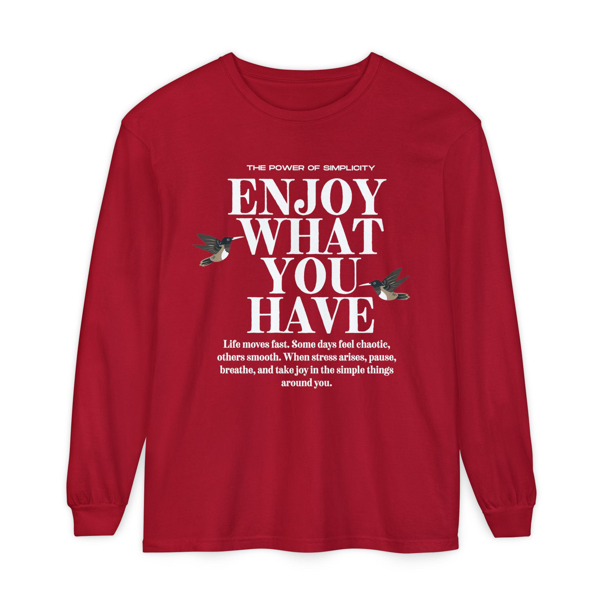 This garment-dyed long sleeve shirt carries a calm, confident energy. The soft coral fabric and vintage-washed finish feel like a worn-in favorite from the first wear. Bold, serif lettering on the chest reads "ENJOY WHAT YOU HAVE," framed by two small hummingbird illustrations — a quiet reminder to slow down and notice simple pleasures. The classic fit and medium-weight cotton give it structure without stiffness. Wear it on cool mornings with jeans, layered under a jacket at a farmers' market, or lounging at home with a book. It settles into your routine like an easy habit: steady, warm, and unpretentious.