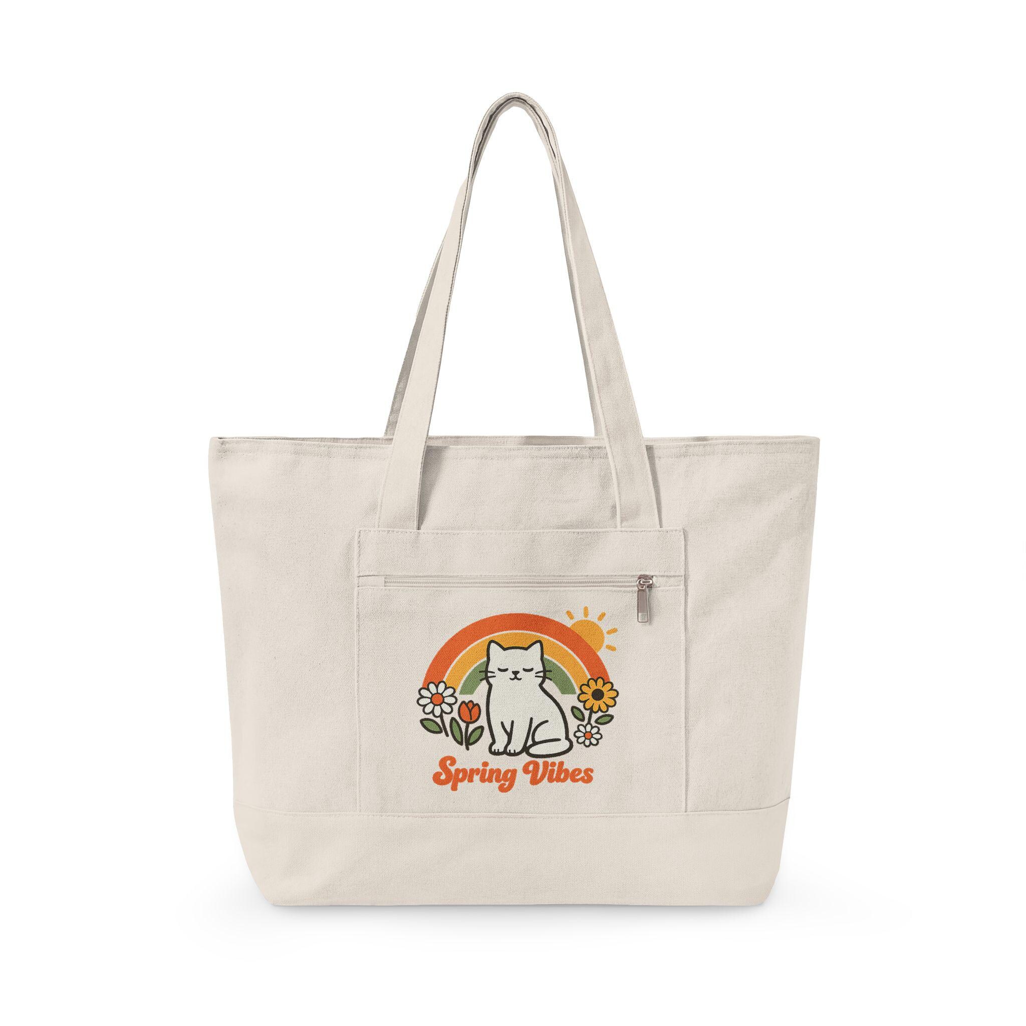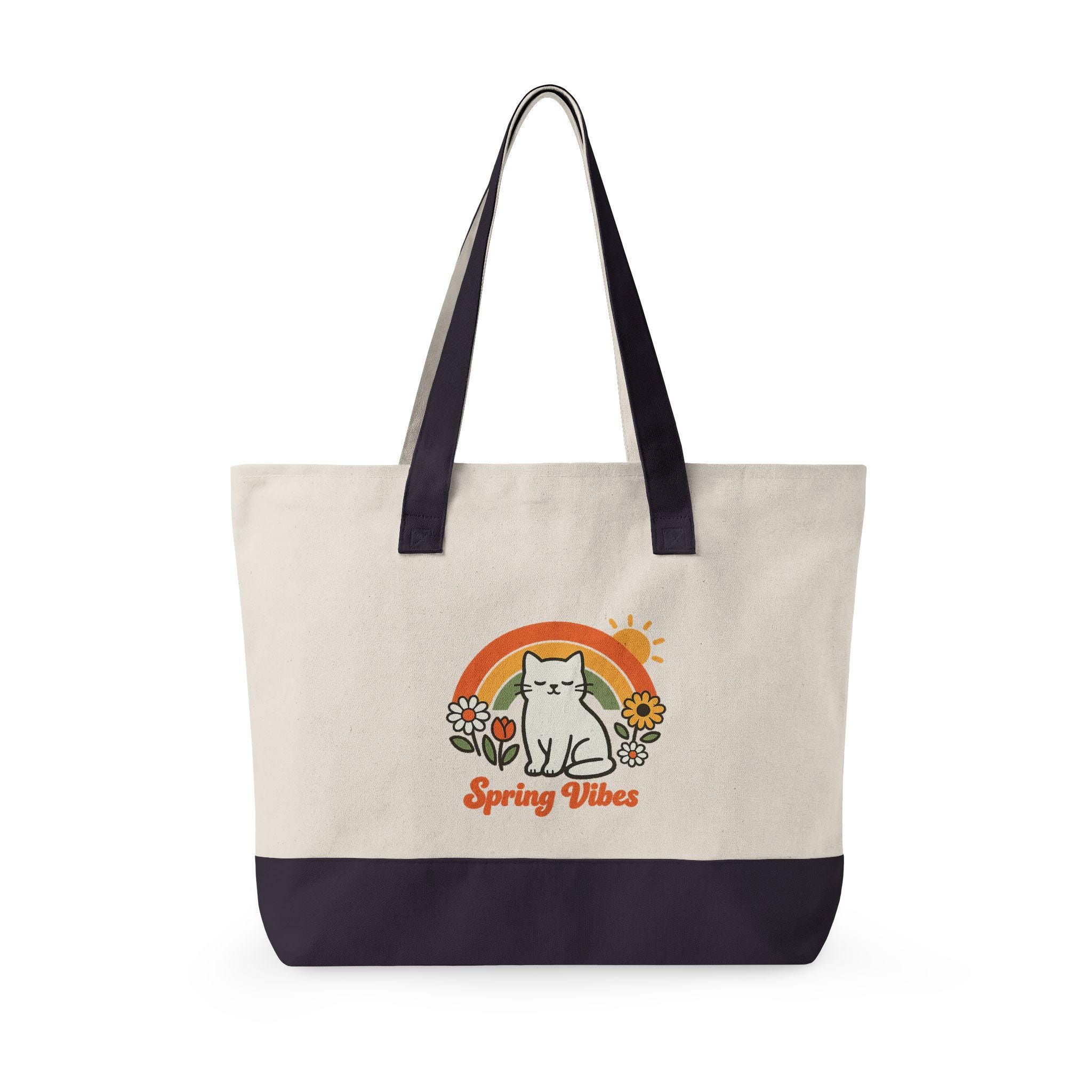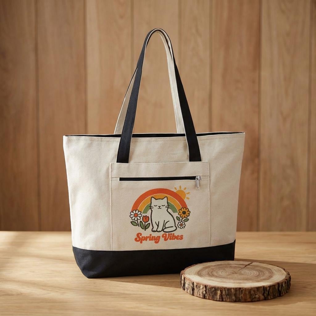 Carry a little sunshine with you. This heavy-duty canvas tote feels sturdy from the first lift — thick cotton, wide base, and a full zipper that keeps groceries, sketchbooks, or everyday clutter safely tucked inside. The front pocket sits ready for keys and phone; the roomy main compartment swallows a laptop, water bottle, and more. The playful embroidered-style cat and retro rainbow design adds a warm, nostalgic note: floral accents and a sleepy feline that fits right into slow-morning routines and sunny weekend markets. Comfortable shoulder handles and a generous 19L capacity make it a dependable companion for market runs, studio days, or casual outings when you want something that looks friendly and holds up to real use.