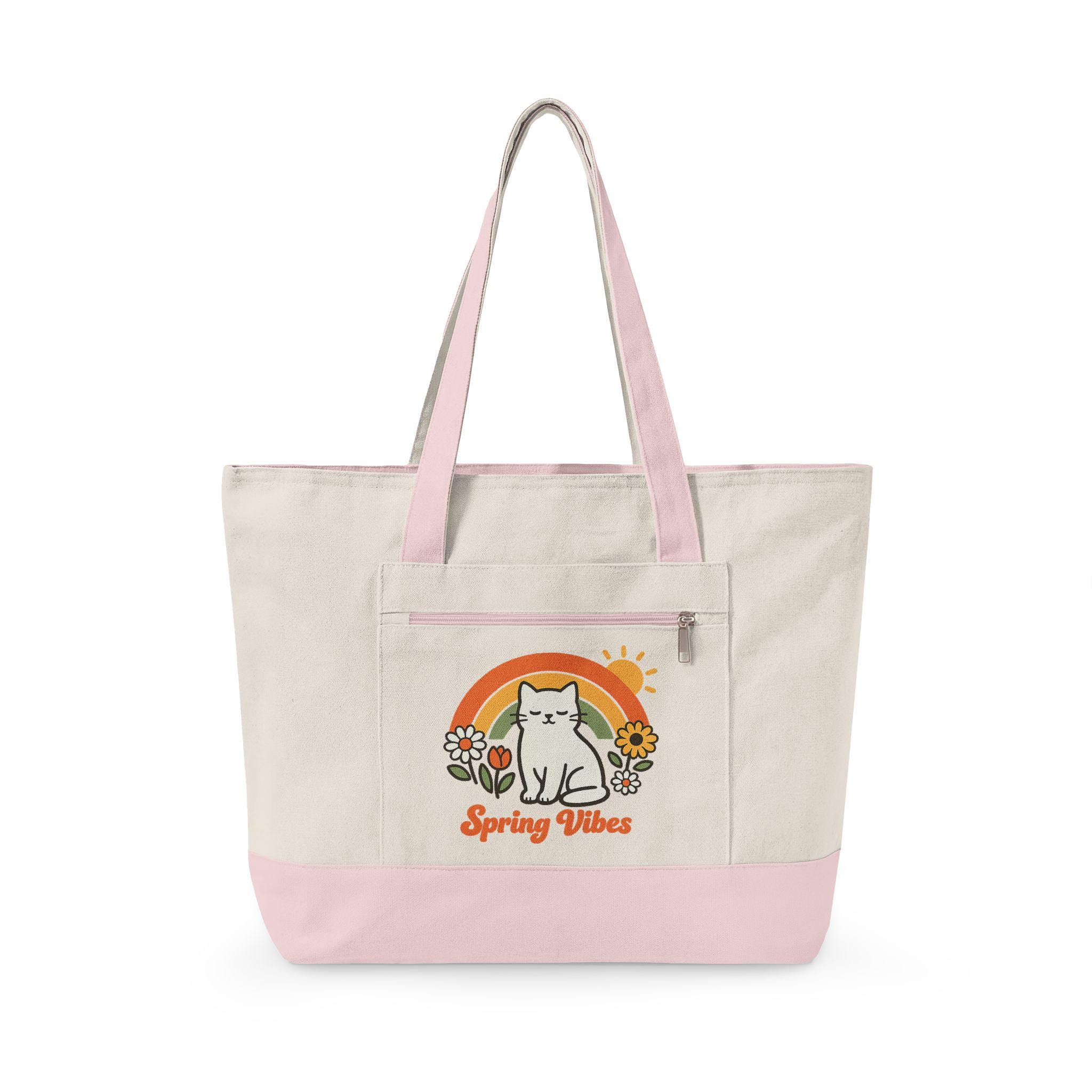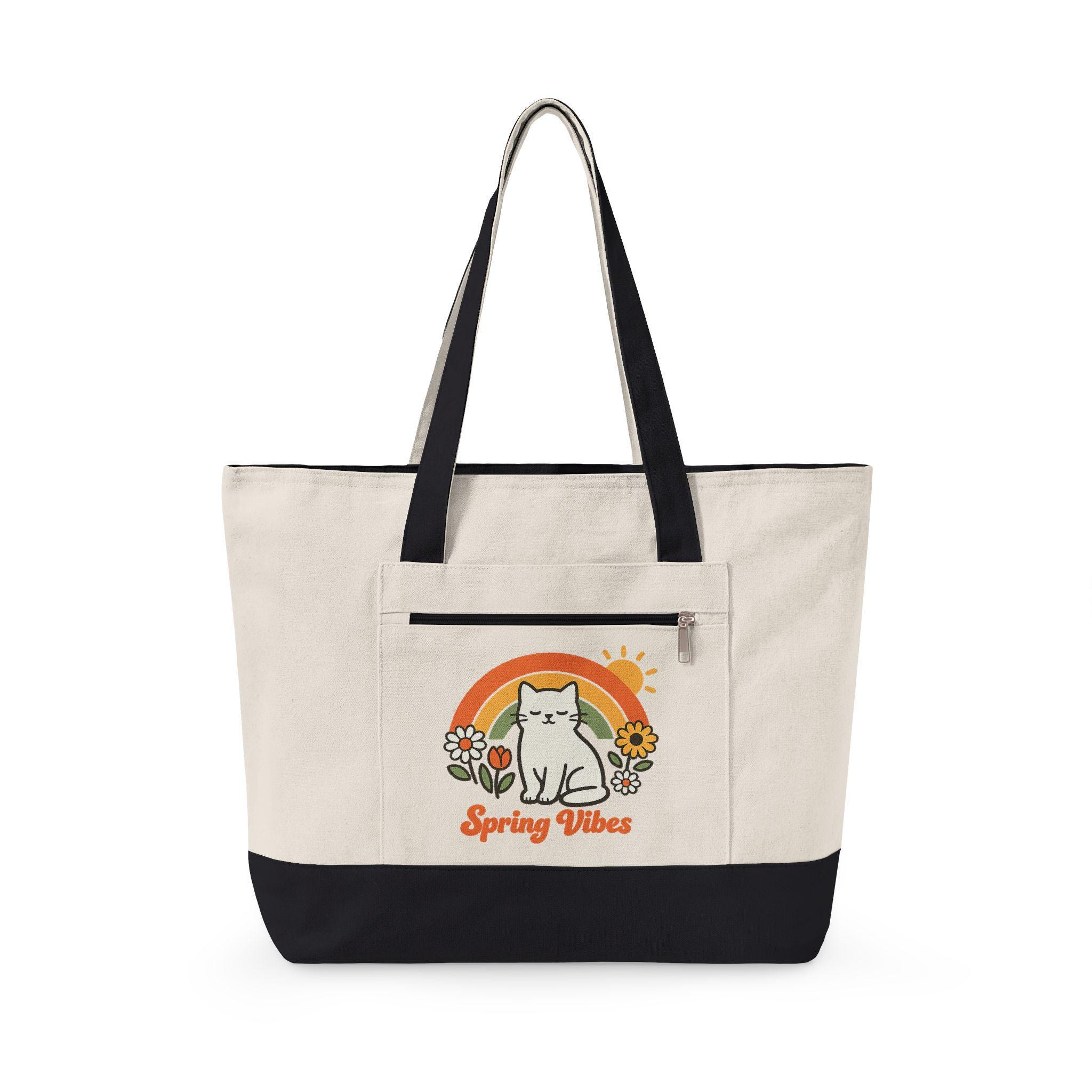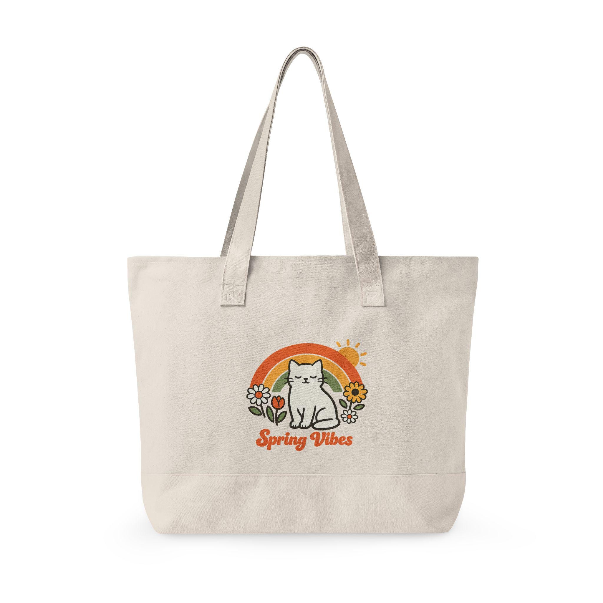 Carry a little sunshine with you. This heavy-duty canvas tote feels sturdy from the first lift — thick cotton, wide base, and a full zipper that keeps groceries, sketchbooks, or everyday clutter safely tucked inside. The front pocket sits ready for keys and phone; the roomy main compartment swallows a laptop, water bottle, and more. The playful embroidered-style cat and retro rainbow design adds a warm, nostalgic note: floral accents and a sleepy feline that fits right into slow-morning routines and sunny weekend markets. Comfortable shoulder handles and a generous 19L capacity make it a dependable companion for market runs, studio days, or casual outings when you want something that looks friendly and holds up to real use.