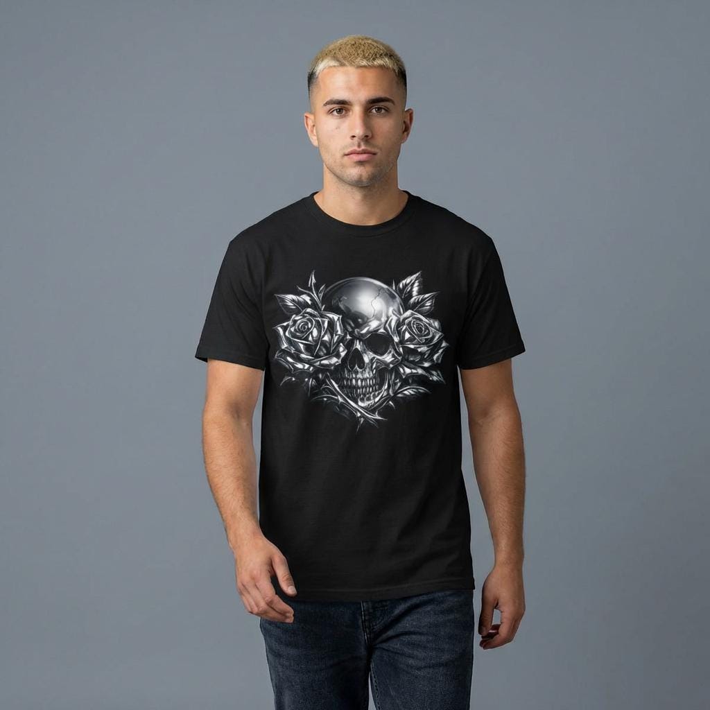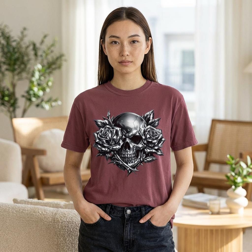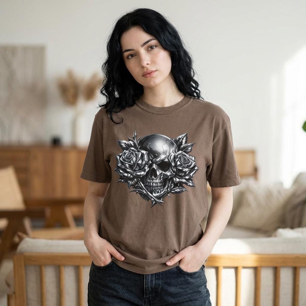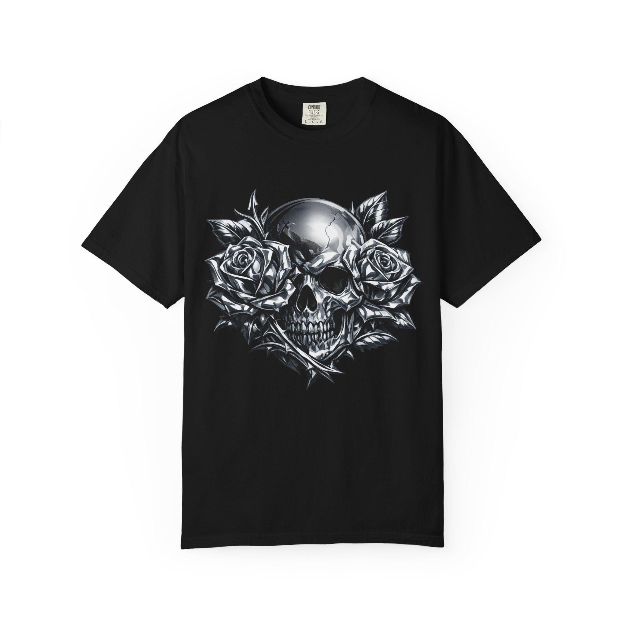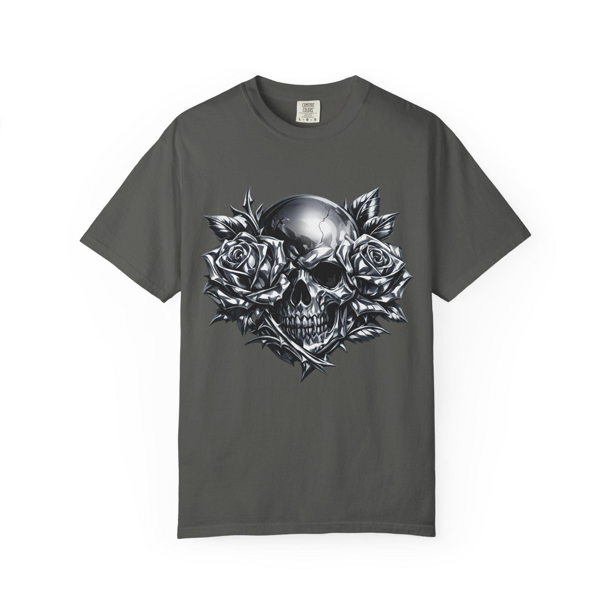 Make a statement with this heavyweight garment-dyed tee featuring a striking chrome skull framed by full-bloom roses. The bold grayscale artwork blends dark romance with raw streetwear energy, creating a graphic that feels personal and iconic. Crafted from premium ring-spun cotton, the fabric is soft, durable, and broken-in from the first wear. Its relaxed, pre-shrunk fit drapes naturally for effortless layering or standout solo styling. Built with reinforced stitching and a seamless tubular knit, this tee is designed for everyday wear without sacrificing comfort. Whether you’re heading to a late-night show, cruising on a motorcycle, or keeping it low-key on the weekend, this shirt anchors your look with grit and presence.