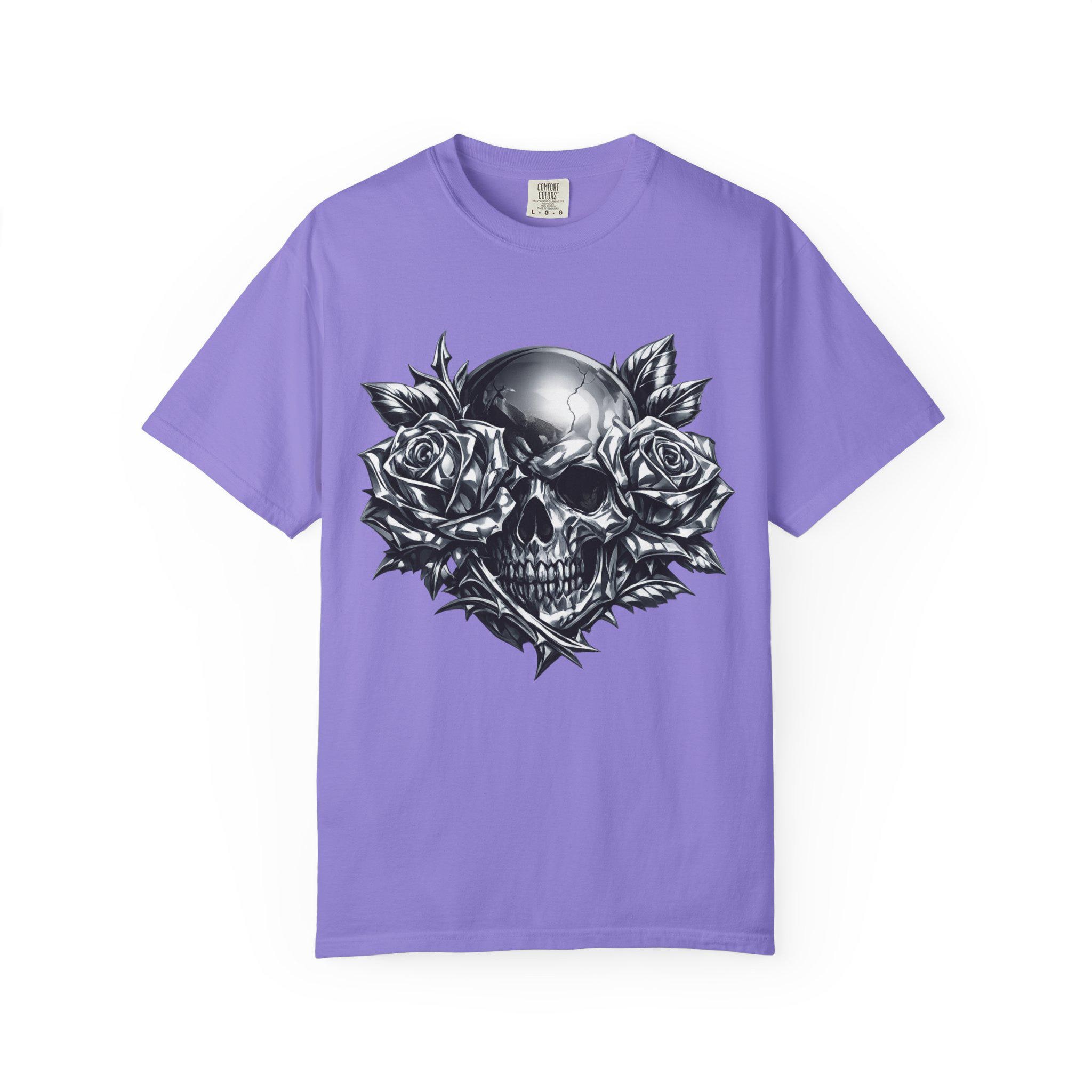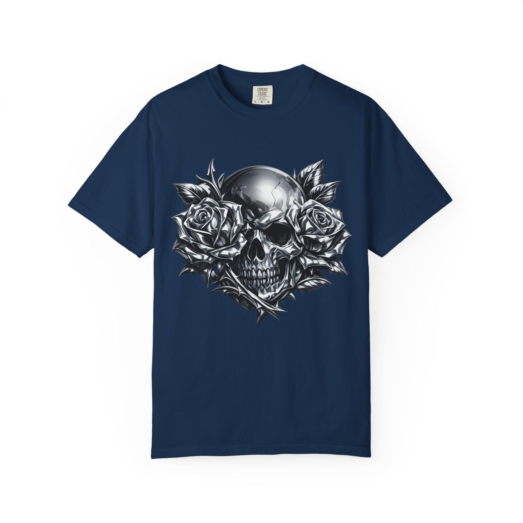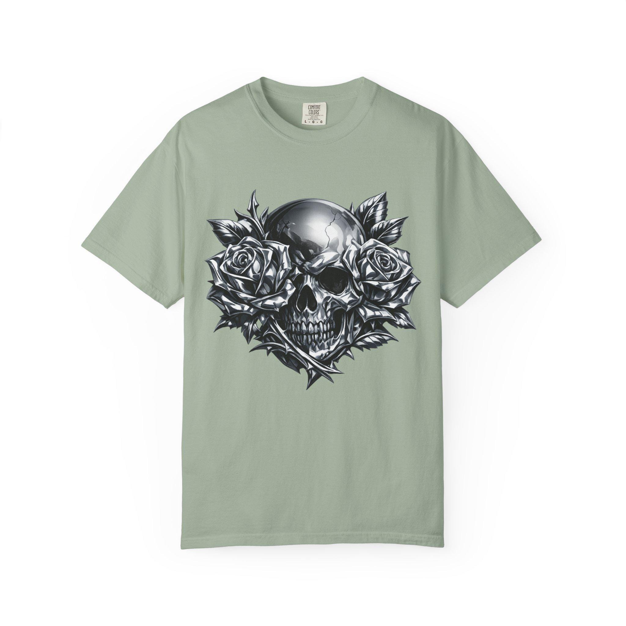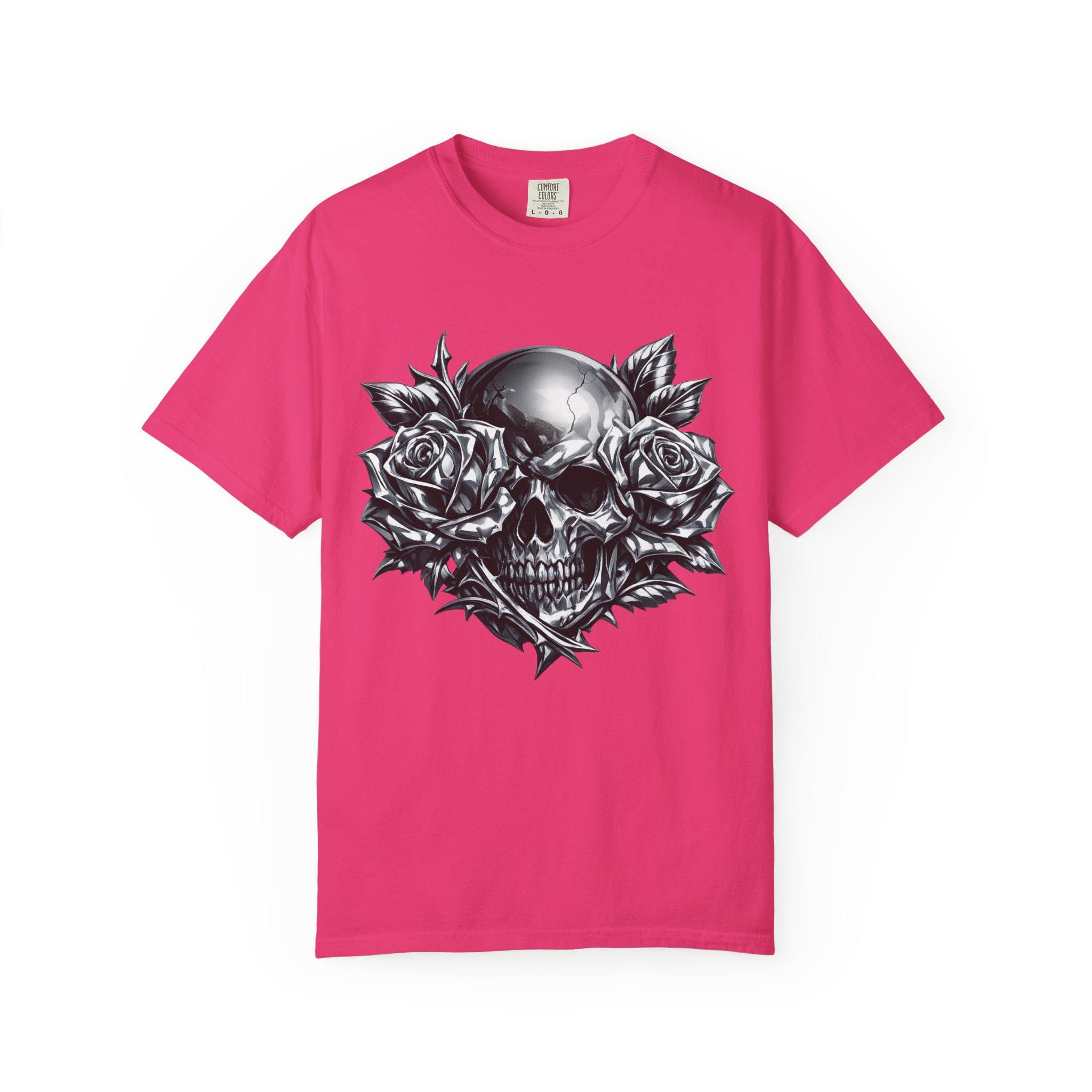 Make a statement with this heavyweight garment-dyed tee featuring a striking chrome skull framed by full-bloom roses. The bold grayscale artwork blends dark romance with raw streetwear energy, creating a graphic that feels personal and iconic. Crafted from premium ring-spun cotton, the fabric is soft, durable, and broken-in from the first wear. Its relaxed, pre-shrunk fit drapes naturally for effortless layering or standout solo styling. Built with reinforced stitching and a seamless tubular knit, this tee is designed for everyday wear without sacrificing comfort. Whether you’re heading to a late-night show, cruising on a motorcycle, or keeping it low-key on the weekend, this shirt anchors your look with grit and presence.