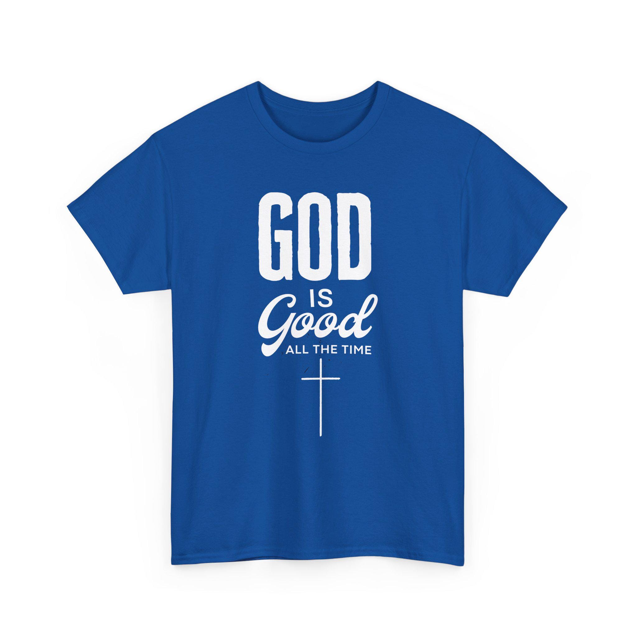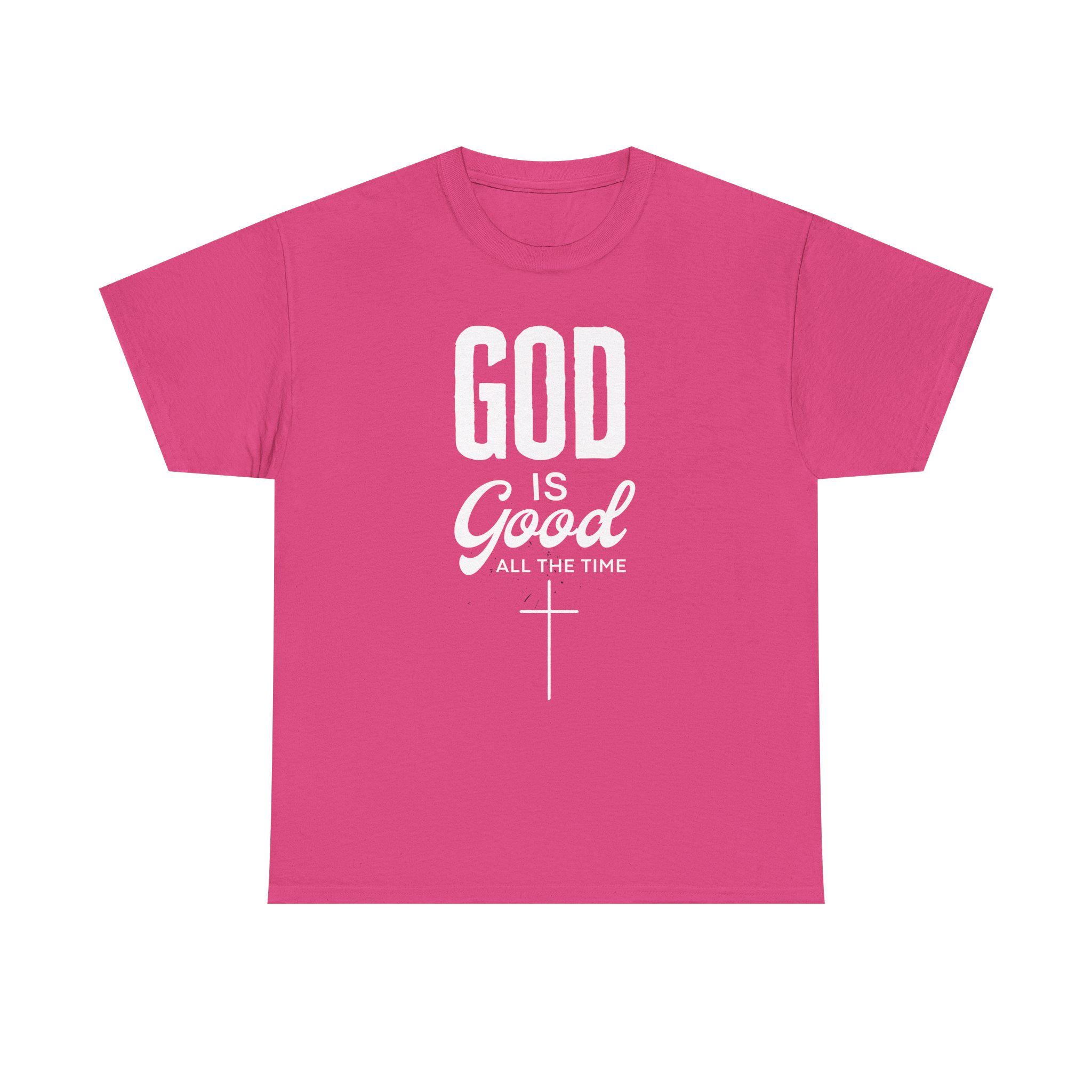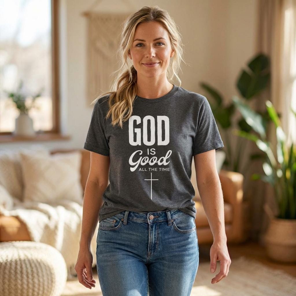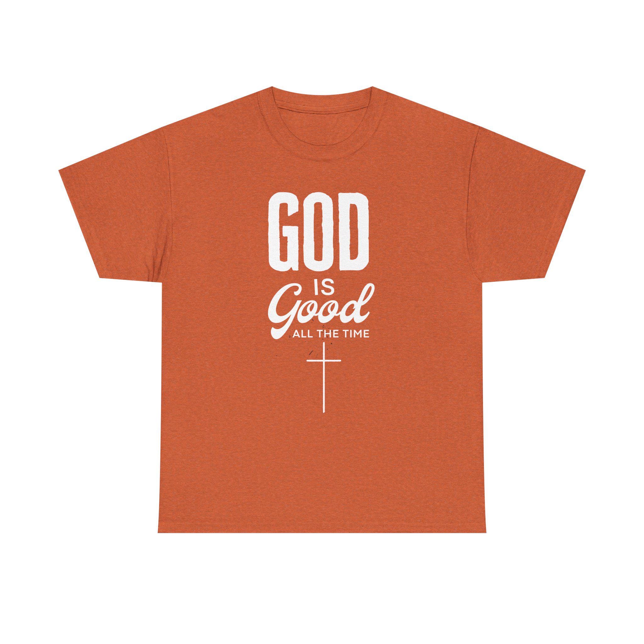 Carry a simple, confident message of faith with this soft, durable tee. The warm russet tone and clean white lettering read "GOD IS Good ALL THE TIME" above a minimal cross, giving the shirt a calm, grounded presence that settles easily into quiet mornings, church gatherings, or neighborhood outreach. The classic crew cut and relaxed fit let it layer under jackets or stand alone on warm days. Wear it to church picnics, volunteer events, or whenever you want to share a gentle reminder without saying a word. The understated design and textured fabric details give it an authentic, lived-in feel that complements everyday routines and seasons of service.